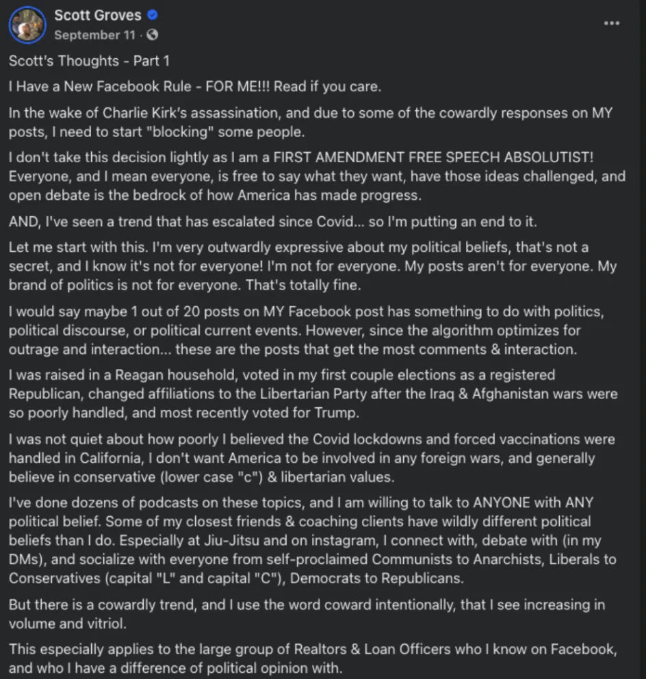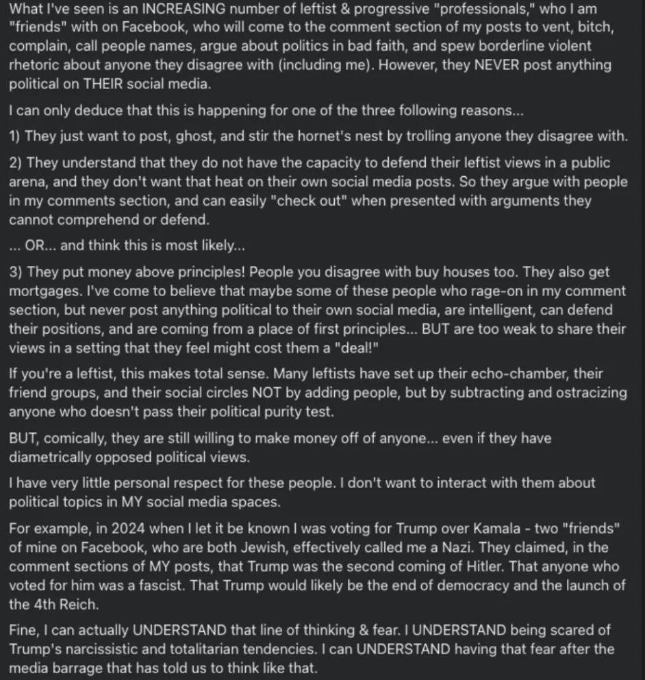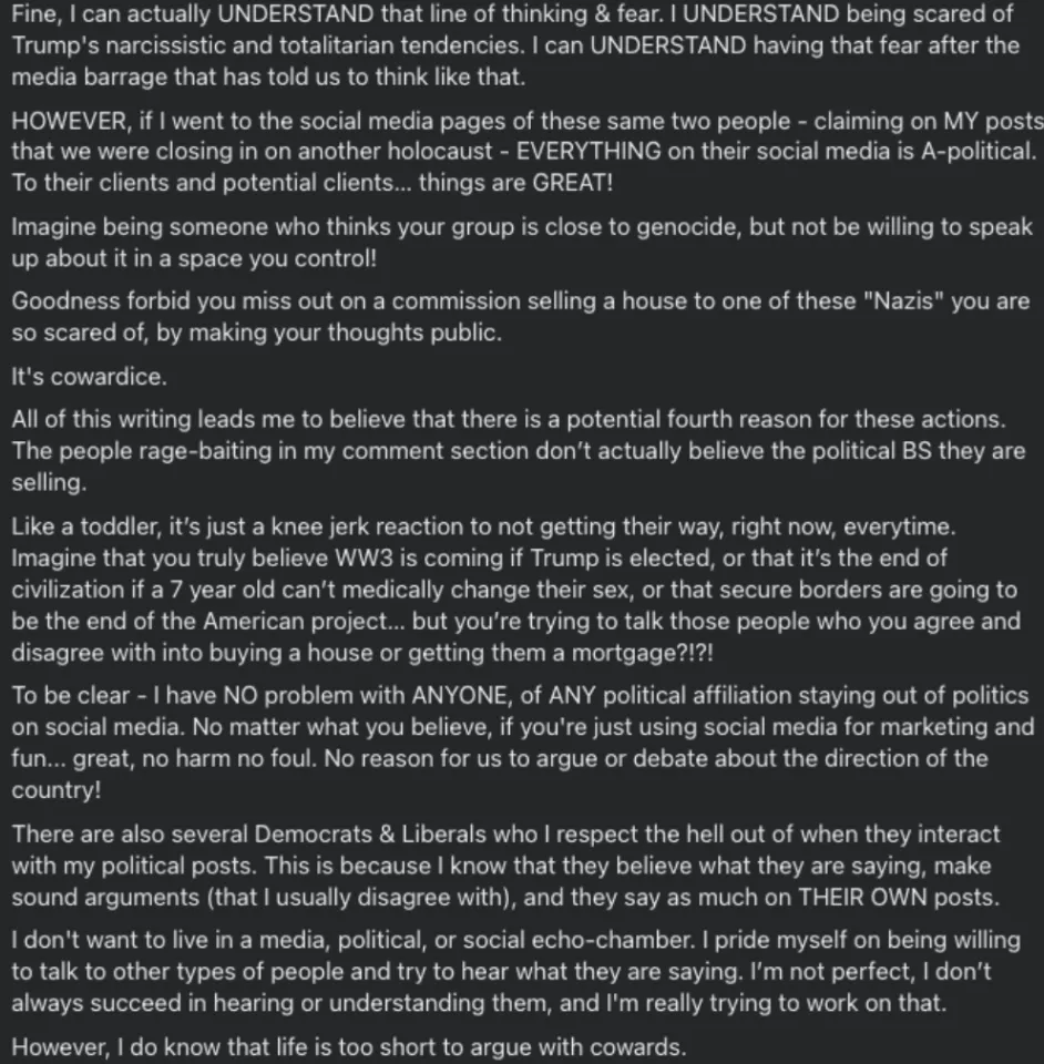 Not that I expect you to zoom in and actually read this Facebook post, but here’s a recent political essay I wrote about the disgusting infighting I see on social media and the cowards who participate the most.